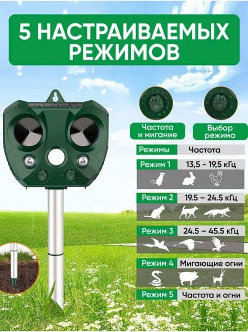 Ультразвук создает неприятные условия для грызунов и отпугивает их в радиусе до 500 квадратных метров. Этот ультразвуковой прибор легко устанавливается. Бесшумный ультразвук не будет беспокоить вас или соседей, а прочный влагозащитный пластиковый корпус прибора легко маскирует его на ландшафте. Экоснайпер оснащен солнечными батареями, что позволяет использовать его на участке без доступа к электричеству - это делает его экономичным и удобным в использовании. Используйте отпугиватель грызунов на даче и в доме, на ферме, на участке, на террасе - везде, где нужна защита от вредителей. Это надежное устройство, в том числе отпугивает лис, зайцев и птиц. Защитите свой дом и имущество с помощью отпугивателя мышей ультразвукового. Не оставляйте шансов грызунам и другим вредителям - приобретайте надежный помощник в борьбе с ними уже сейчас!