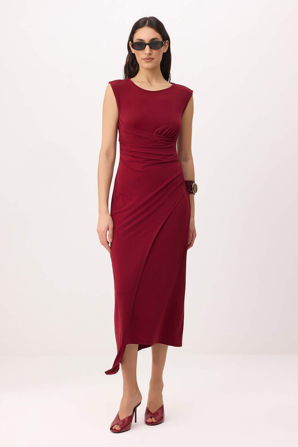 • Bordo Duz A-line Bisiklet Yaka Kolsuz Buzgulu Midi Esnek Astarl? Orme Elbise TWOSS26EL00011