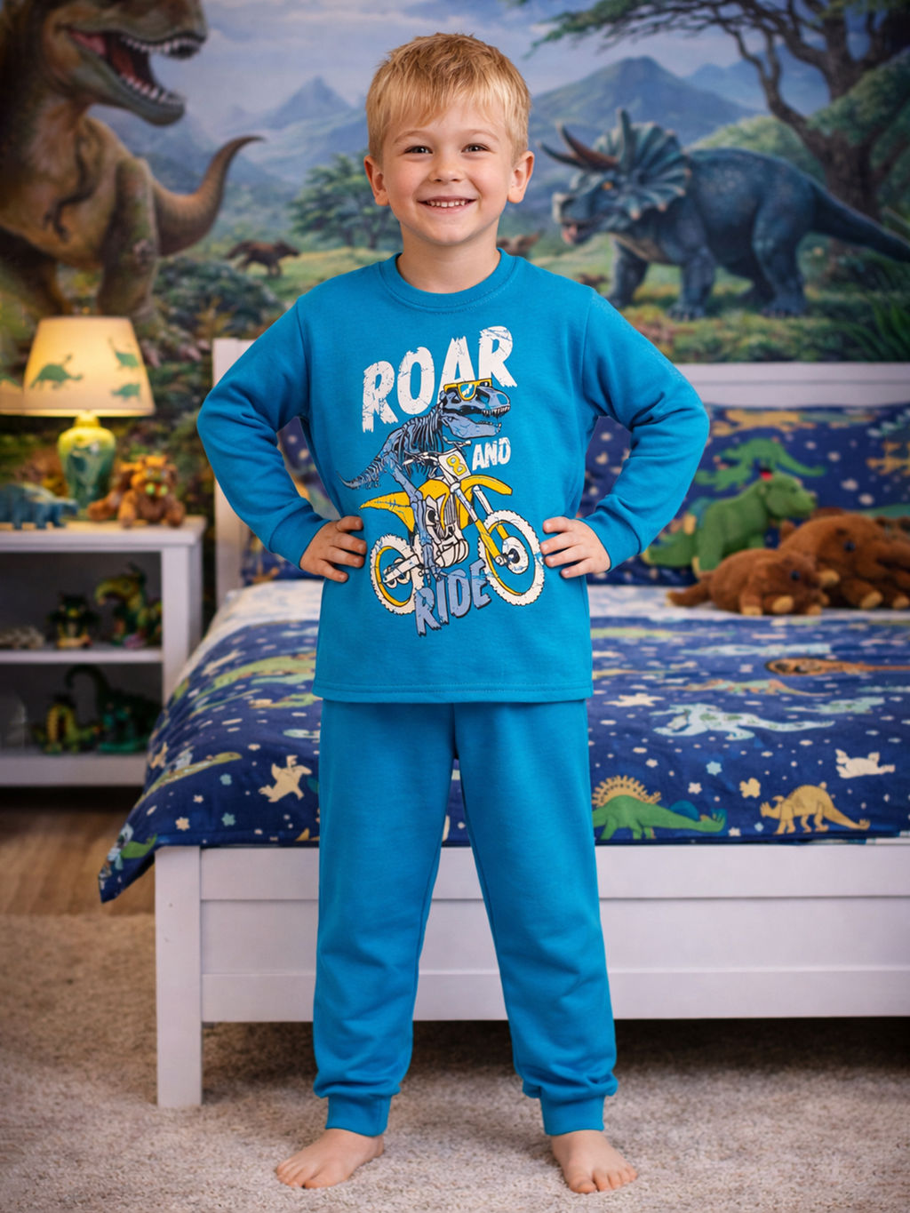 Пижама для мальчиков для сна дома и в детском саду. Свободный крой из мягкого хлопкового трикотажа. Свитшот с эластичной горловиной, брюки на резинке. Двухслойные манжеты на рукавах и штанинах. Бирюзовый цвет с ярким принтом " Динозавр на мопеде " .