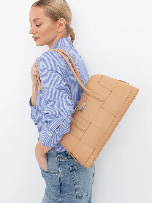 Сумка-плетенка, выполнена из экокожи. Дополнена серебристой фурнитурой. Данная модель закрывается на молнию, носится в руке за встроенные ручки с фиксацией. Каркас полужесткий.