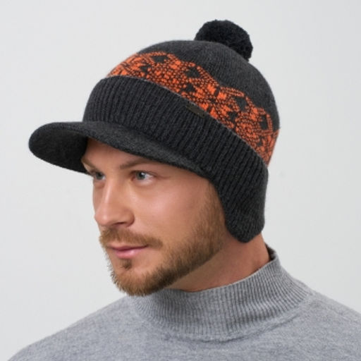 Однослойная жаккардовая бейсболка с ушками, отворотом, и трикотажным однотонным помпоном