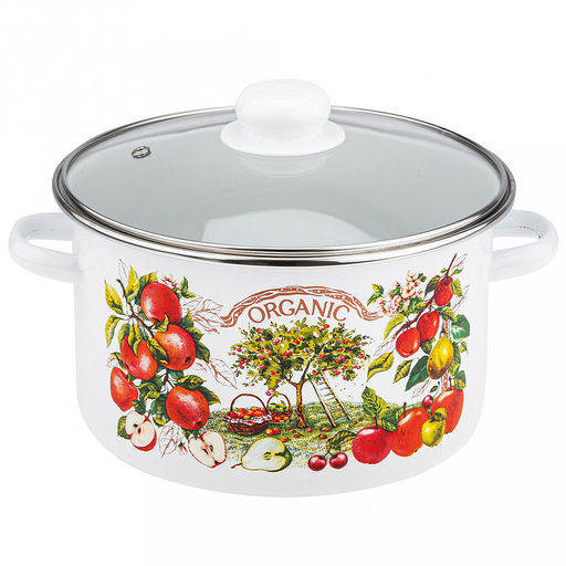 "Organic" Кастрюля эмалированная 4л, цилиндрическая форма, стеклянная крышка с пластмассовой ручкой-кнопкой, ободок из нержавеющей стали, белый (Россия)