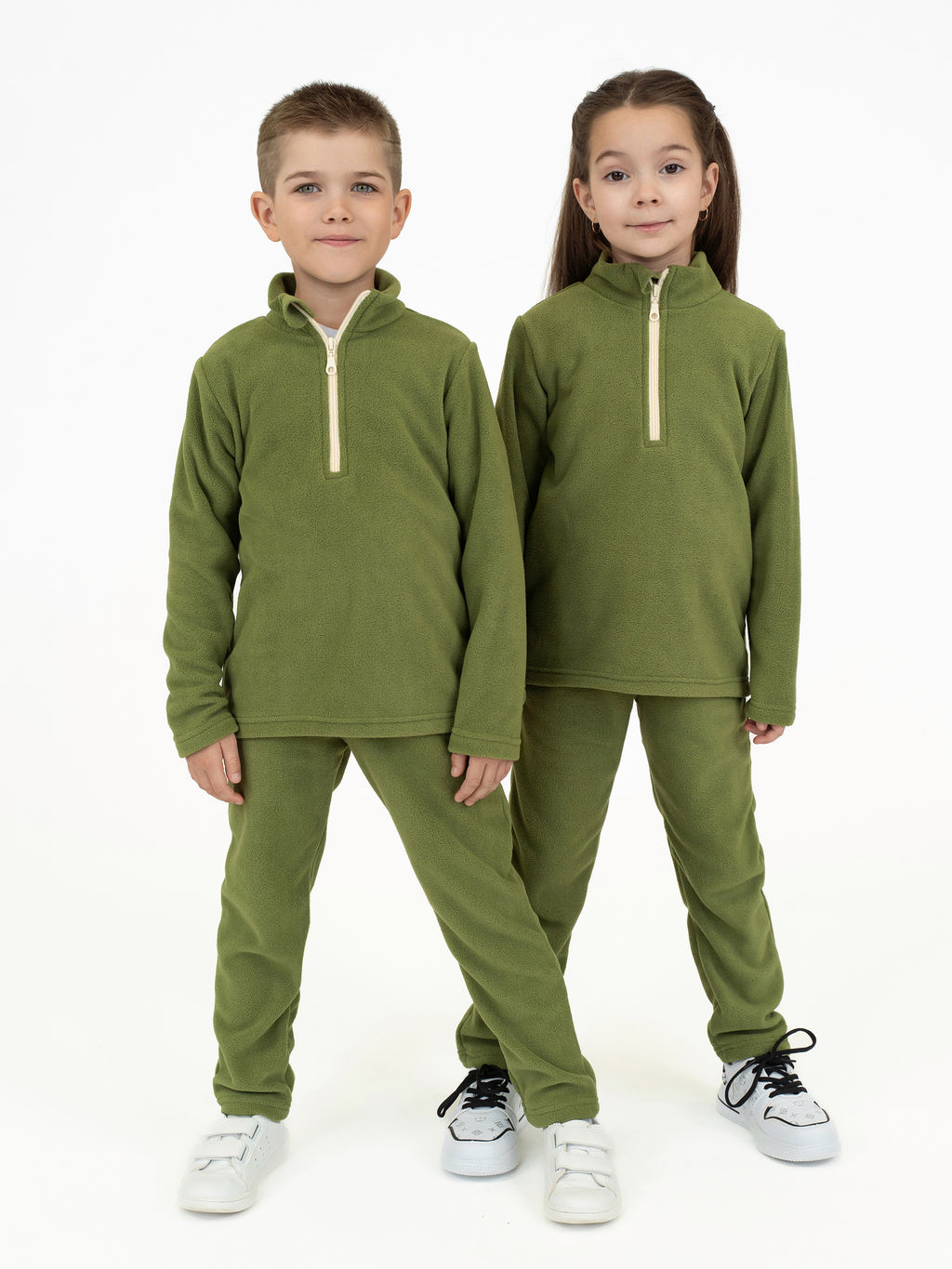 Детский спортивный костюм из флиса шелис однотонного цвета хаки свободного кроя. Комплект из кофты с высоким воротником стойкой на молнии и штанов на поясе с резинкой. Молния доходит до середины груди. На воротнике клапан для бегунка. На самом бегунке удобный пуллер. Края штанин и рукавов подогнуты и прошиты. Может носиться самостоятельно или использоваться как поддева зимой.