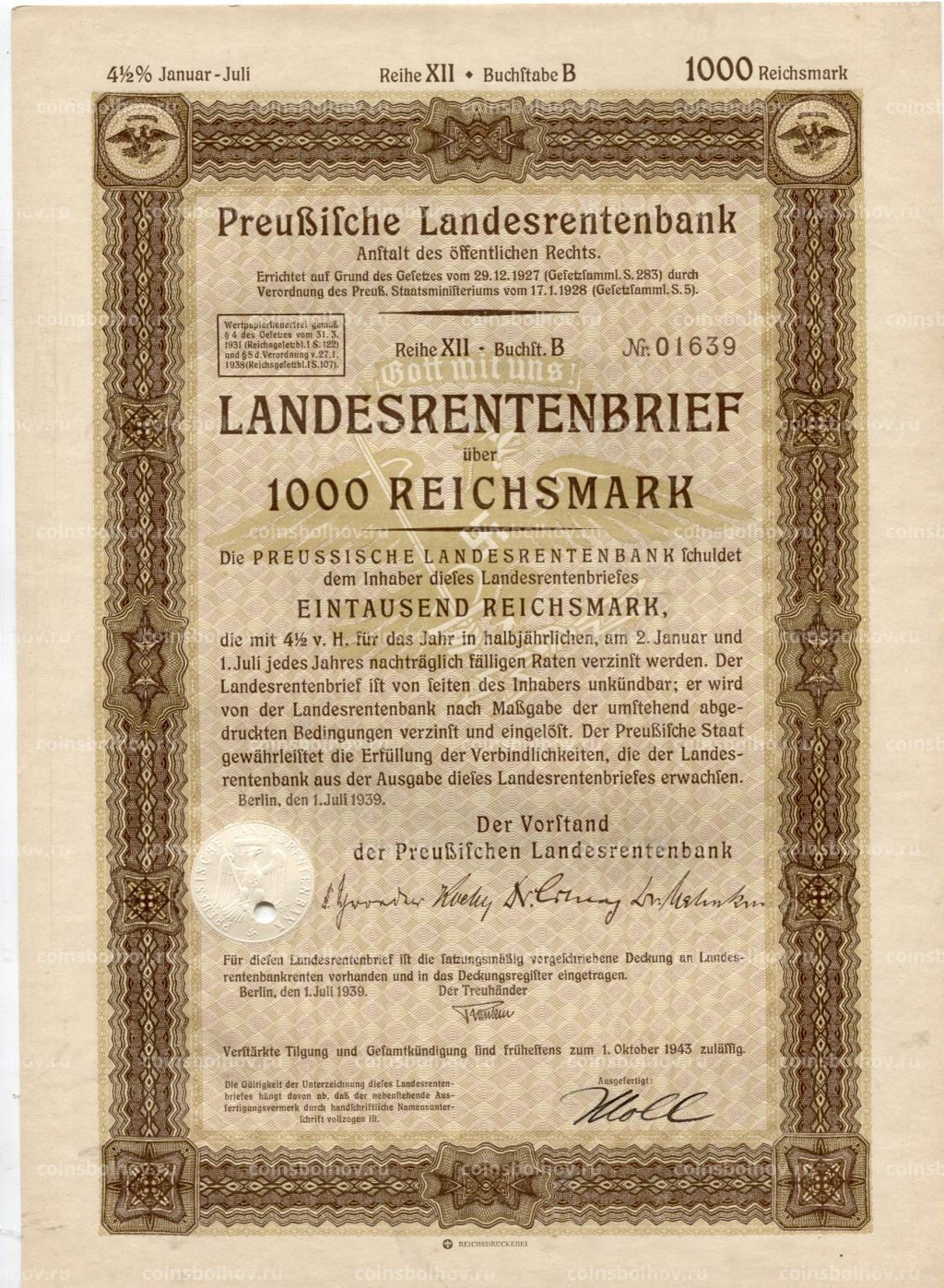 • Облигация 4,5% 1000 рейхсмарок 1939 года Германия