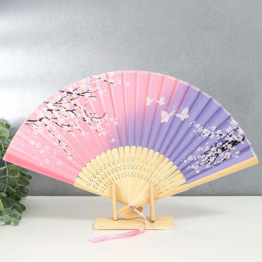 • Веер складной с кисточкой h=21 см Бабочки в сакуре, сиренево-розовый