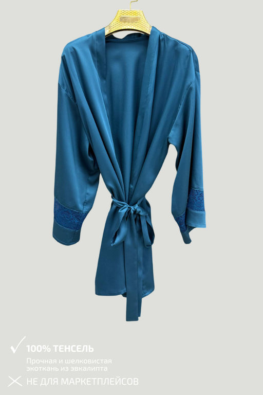 Свободный, продуманный крой красиво ложится по фигуре, формируя элегантный силуэт без лишнего объёма. Пояс на талии подчёркивает женственные линии, позволяя регулировать посадку, а кружевные вставки на рукавах добавляют образу изысканный акцент и лёгкую нотку чувственности. Каждая деталь от аккуратной обработки краёв до гармоничного сочетания текстур говорит о внимании к качеству и дизайну.