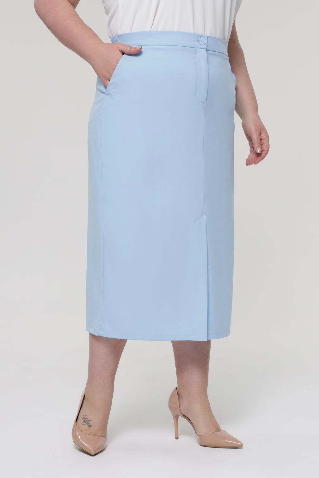 Элегантная юбка-карандаш из мягкой ткани с добавлением стрейча. Модель отлично сидит за счет притачного пояса. Боковые карманы с отрезным бочком добавляют юбке практичности и функциональности. Модель с комфортной посадкой не сковывает движений,  застегивается спереди на пуговицу и скрытую молнию. Центральный шов по переду переходит в  кокетливую шлицу. Всесезонная,  практичная, универсальная модель юбки отлично структурирует и собирает фигуру в проблемных местах за счет плотности ткани и конструктивных швов. Являясь базовой моделью, удачно сочетается с обувью и одеждой разных стилистических направлений, прекрасно вписываясь как в классический, так и альтернативный гардеробы, создавая актуальные вариативные образы на все случаи жизни.­