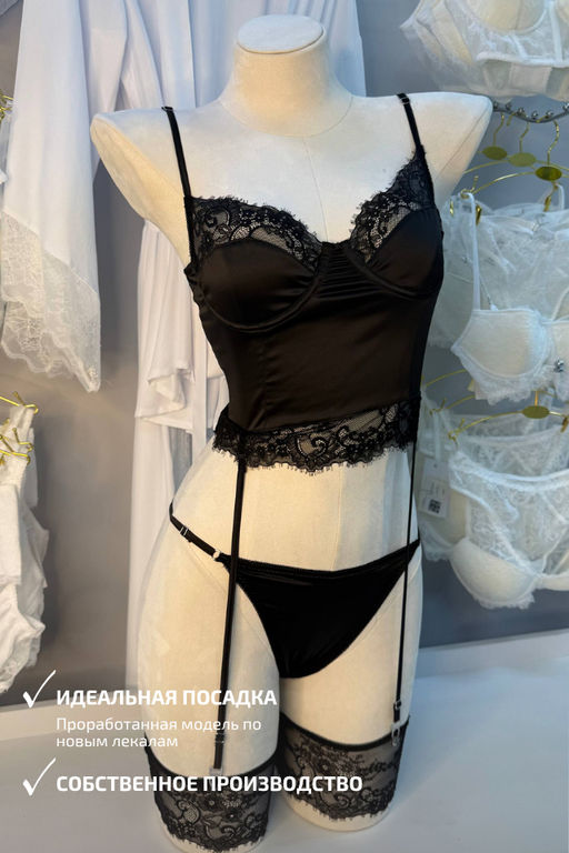Изысканный комплект в глубоком чёрном цвете воплощение современной чувственности и архитектурной эстетики. Корсетный бюстгальтер с формованными чашками подчёркивает линию декольте и обеспечивает безупречную поддержку.