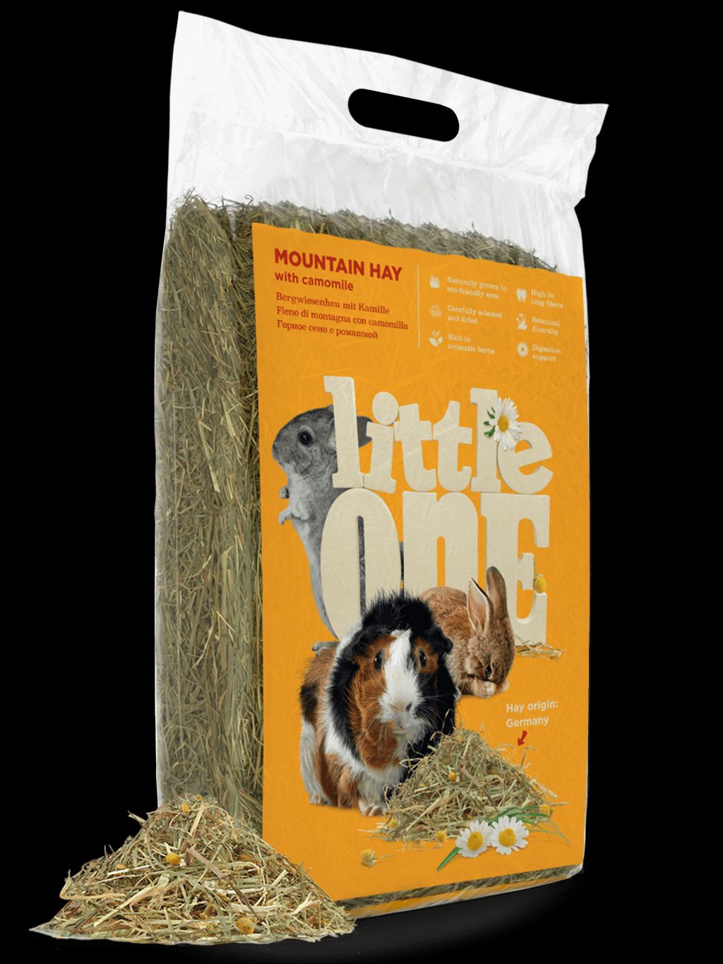 Горное сено с ромашкой Little One ароматное, очищенное и высушенное; собрано в экологически чистых горных районах и обогащено цветами ромашки. Сено является основной составляющей рациона всех травоядных животных (кроликов, морских свинок, шиншилл, дегу), поэтому важно обеспечить его постоянное наличие в клетке.