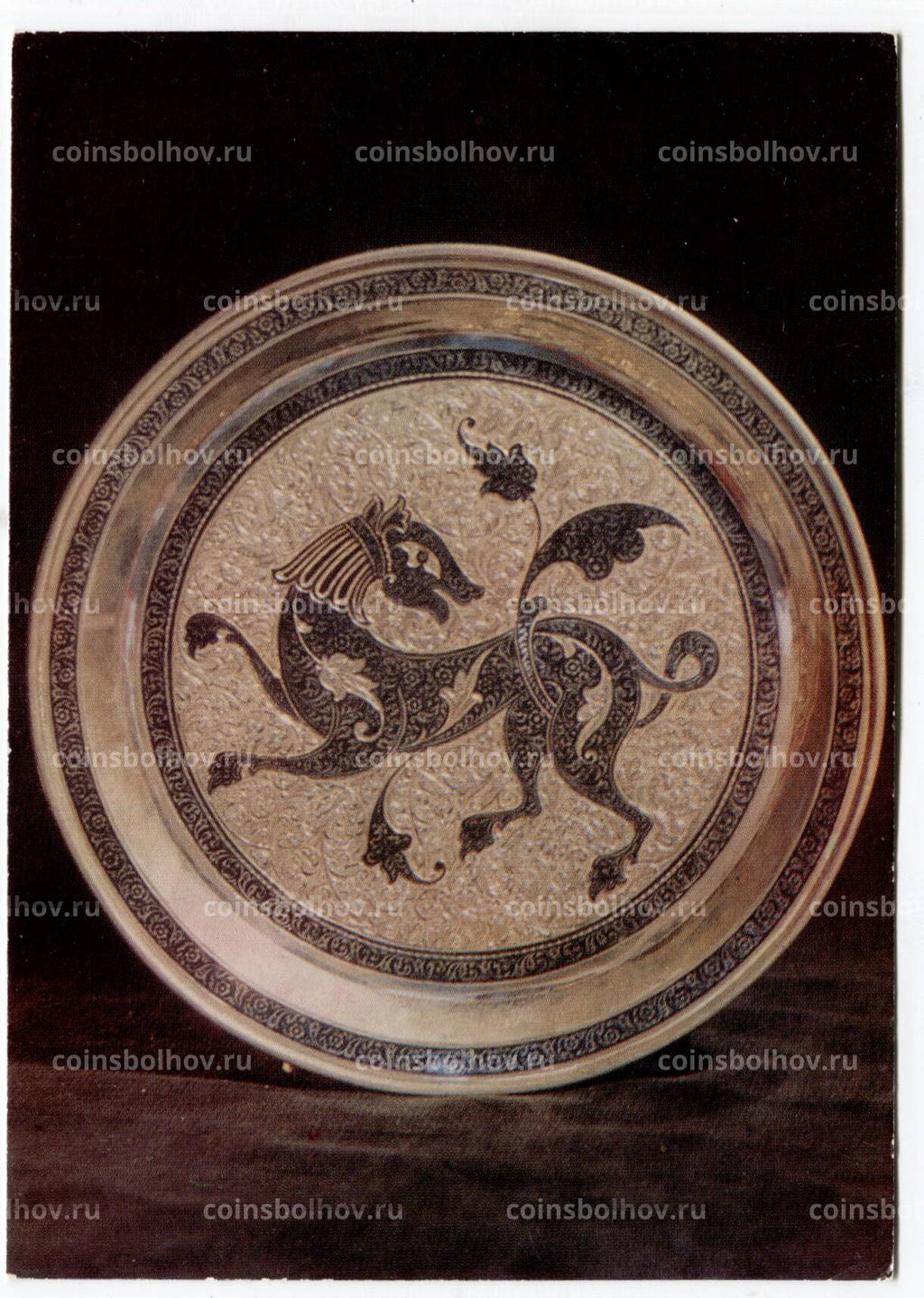 Открытка Тарелка с изображением зверя. Мастер Расул Алиханов. Серебро. Чернь.графировка.Конец 60-х годов XX века