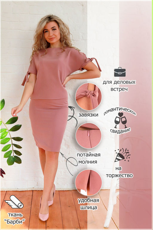 Женский костюм деловой с юбкой выполнен из приятной к телу костюмной ткани хорошей растяжимости. Модный юбочный костюм сезона весна-лето - идеальный вариант на каждый день или для офиса. Строгий классический костюм-двойка подойдет как для высоких, так и для невысоких. Блуза прямого силуэта, юбка прямая до колена, на поясе, без подклада, с высокой посадкой. В заднем шве юбки расположена потайная молния и разрез для удобства ходьбы.