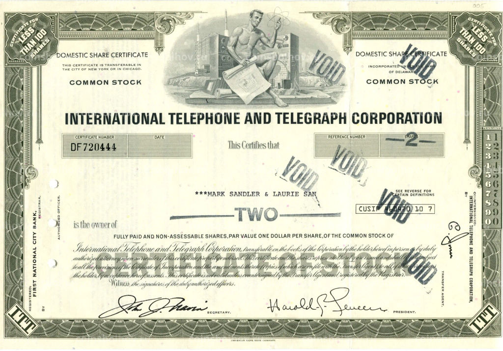 • Сертификат передаточный на 2 акции INTERNATIONAL TELEPHONE AND TELEGRAPH CORPORATION (США)