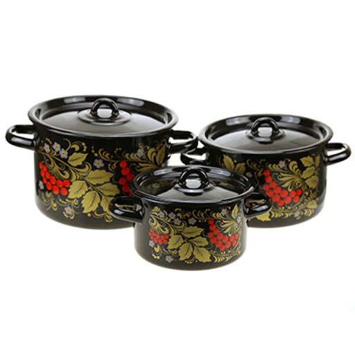 • "Рябина" Набор эмалированных кастрюль 3 предмета: 1,5л, д16см, h10см, 2,9л, д20см, h13см, 4,5л, д22см, h14см, цилиндрическая форма, металлическая крышка, черный (Россия)