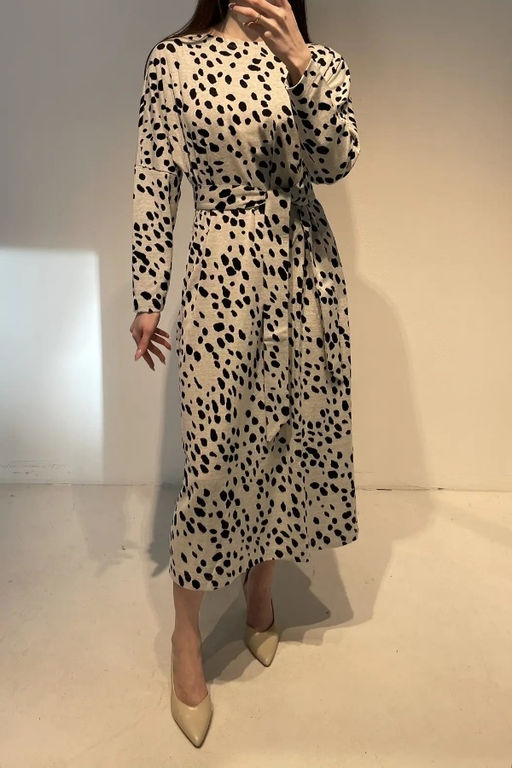 Платье из эластичного полотна с жаккардовым узором. Изделие свободное в верхней части и прилегающее в области талии и бёдер. Рукав оригинального кроя в стиле кимоно. Круглый вырез горловины. В комплекте пояс из основной ткани. В таблице размеров представлены параметры человека, а не изделия.