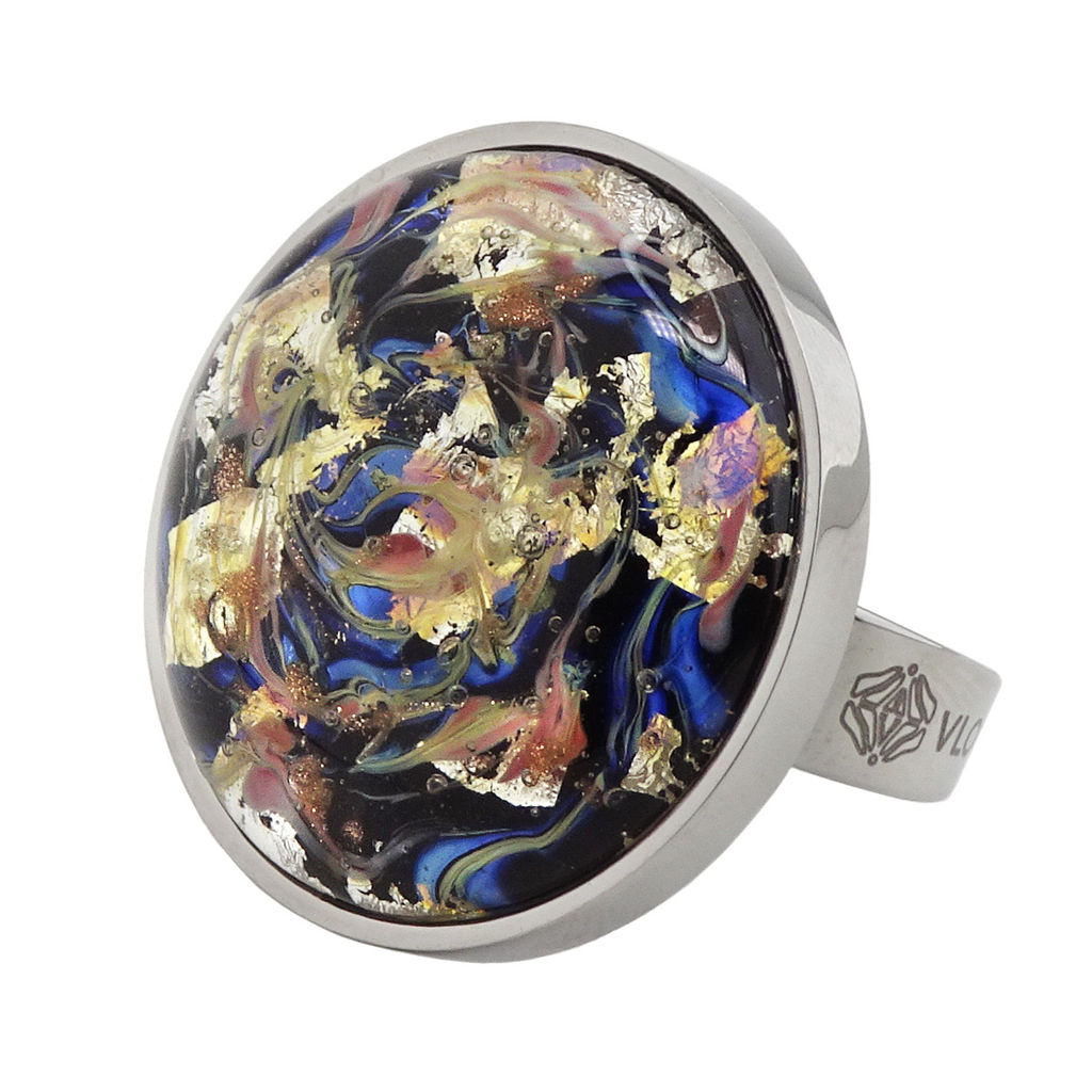 Кольцо изготовлено из муранского стекла и гипоаллергенной ювелирной стали, что очень важно для людей с чувствительной кожей. Металл не темнеет и не подвергается воздействиям окружающей среды, надолго обеспечивая красивый внешний вид изделия. Диаметр стеклянного элемента - 3,2 см. Кольцо безразмерное, регулируется с 16 до 19 размера. Вес - 18 гр.