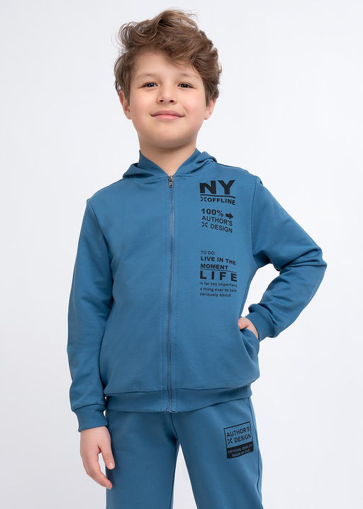 Стильная толстовка для мальчика с манжетами по рукавам и низу дополнена карманами в боковых швах и декорирована оригинальным текстовым принтом. Отлично подходит для повседневной носки, занятий спортом и составит прекрасный комплект с брюками из такого же полотна.