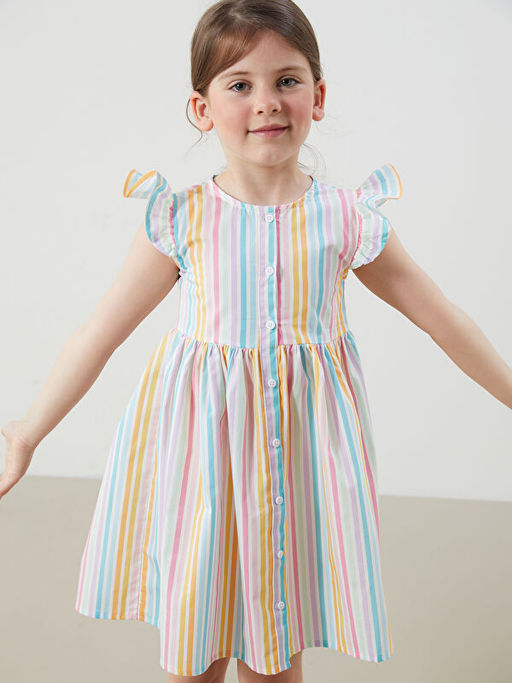 • ?nden D??meli ?izgili K?z ?ocuk Poplin Elbise