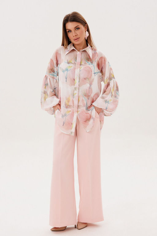 Блузка рубашечного типа, свободного силуэта, со спущенной линией плеча. По переду застежка на петли пуговицы. Рукава обьемные (буфы), по низу рукава резинка.