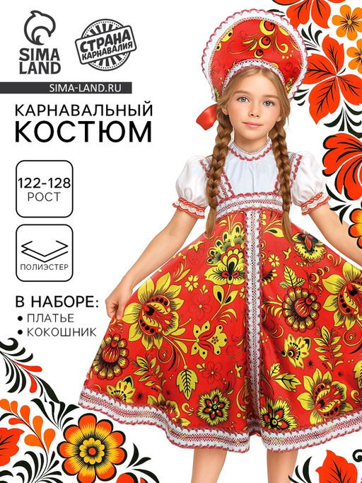 Карнавальный костюм «Хохлома» превратит вашу дочку в настоящую красавицу! Такой образ — это потрясающая возможность с головой окунуться в атмосферу народных сказок и сыграть на сцене театра.Яркое платье с имитацией сарафана и кокошник на широких лентах подойдут для тематических праздничных гуляний, танцевальных номеров и других костюмированных творческих мероприятий. А фотосессия в русском народном стиле станет самой запоминающейся! Для кого: Для девочки. Тематика праздника: Новый год. Возраст: Детский. Вид: Русские народные. Длина изделия по спинке, см: 79. Тематика: Русские народные. Бесплатная доставка: Да. Наша разработка: Да.