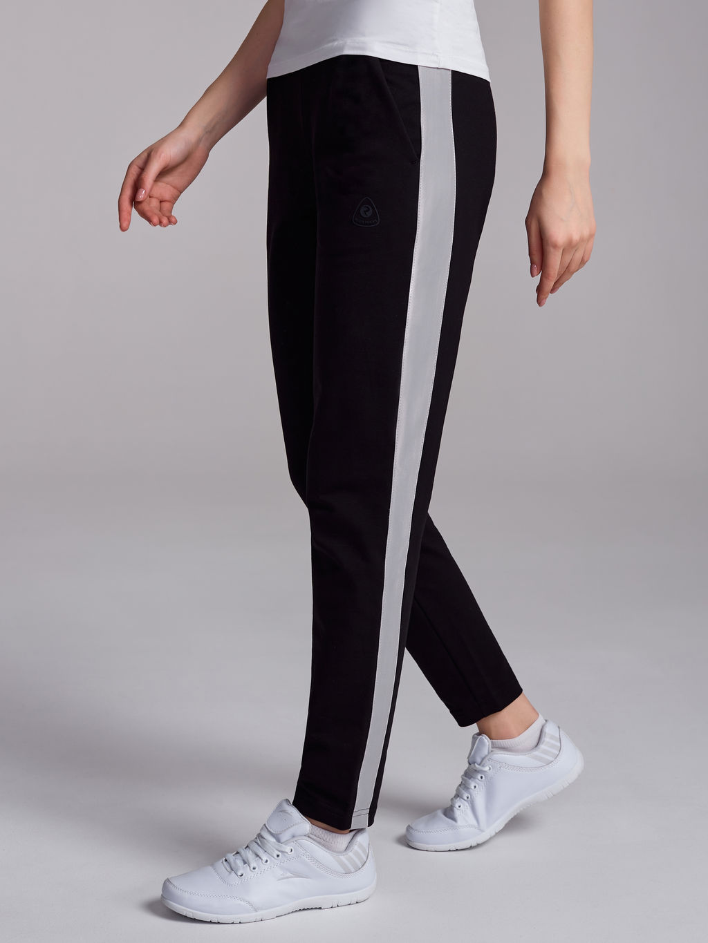 Брюки женские из хлопкового трикотажа приталенного силуэта. Пояс и дополнительная полоса контрастного цвета выполнены из основной ткани. На поясе с левой стороны вышивка фирменного логотипа.