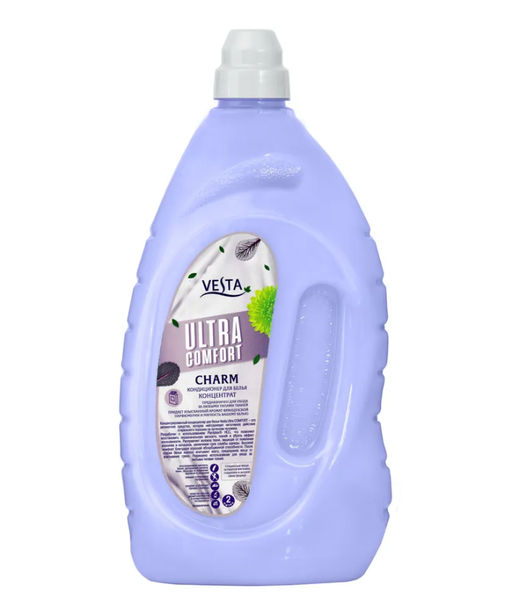 Парфюмированный кондиционер для белья VESTA Ultra comfort CHARM 2 литра. Концентрированный кондиционер для белья VESTA Ultra COMFORT это деликатное средство, которое нейтрализует негативное действие стирального порошка на организм человека. Разработан с использованием Plantatex HCC, что позволяет восстановить первоначальную мягкость тканей и убрать эффект изношенности. Расправляет волокна ткани, защищая от появления ворсинок и катышков, увеличивая срок службы одежды. Высокий комфорт благодаря хорошей абсорбционной способности. После стирки белье хорошо впитывает влагу, предохраняя вещи от впитывания грязи. Разрешено использование для ухода за любыми типами тканей.
