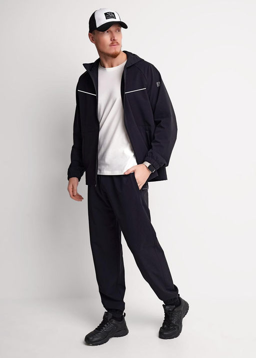 Мужские спортивные брюки выполнены из плащёвки на трикотажной основе. Изделие с эластичным поясом на шнурке, боковыми карманами на молнии и манжетами на резинке. Комфортная модель для активного отдыха и повседневной носки, дополнена имиджевым принтом. Состав:
