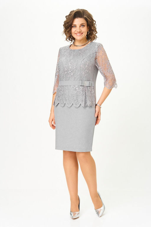 Платье женское прилегающего силуэта с втачным рукавом. Верхняя часть переда с рельефами из проймы. По переду отрезной пояс и баска. Спинка платья со средним швом, с застежкой молнией и разрезом. Рукав длиной ?. Верхняя часть переда, баска и рукав выполнены из кружева. На поясе декоративный бант.