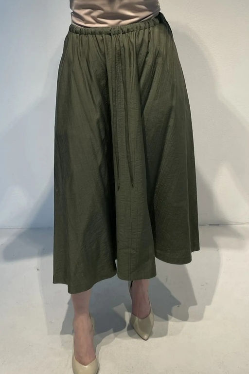 Расклешённая юбка из вискозной ткани с крэш-эффектом. Пояс с эластичной резинкой и кулиской, в боковых швах карманы.