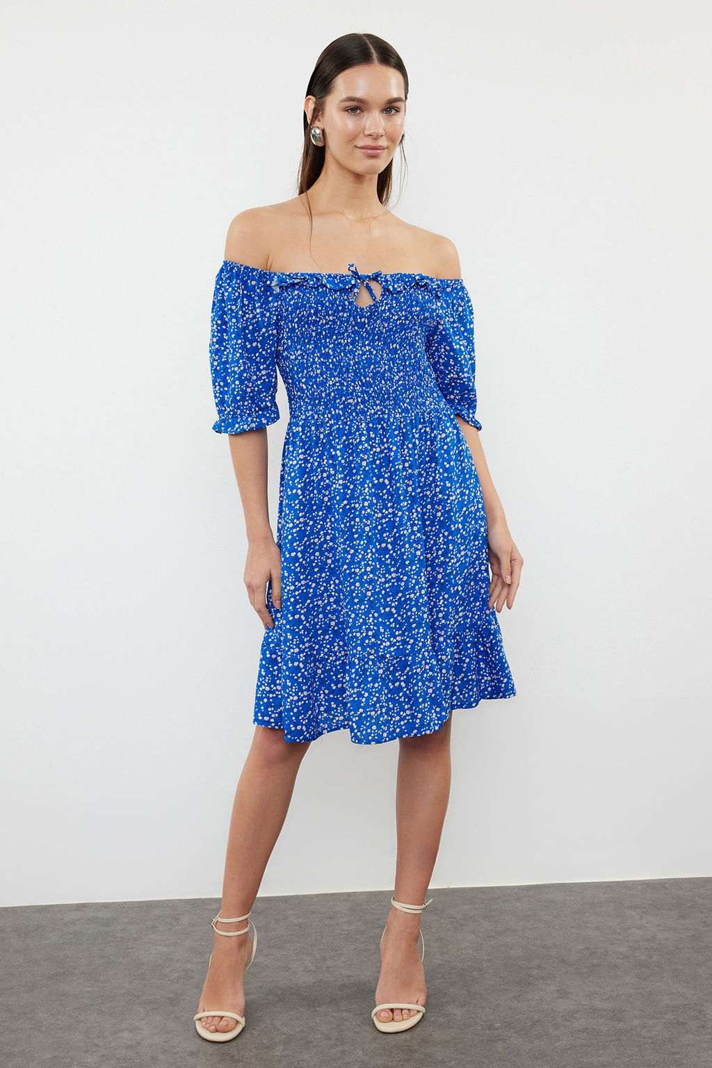 • Mavi Cicekli Desenli Skater Etekli Carmen Yaka Viskon Dokuma Elbise TWOSS24EL01033