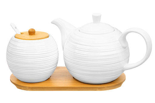 Набор Elan Gallery "Шёлк" на бамбуковой подставке выполнен из белого фарфора и украшен рельефным узором. Этот комплект станет воплощением прекрасного вкуса и поможет создать уют в вашем доме. В комплект входят: чайник заварочный объёмом 900 мл и сахарница 450 мл с бамбуковой крышкой и фарфоровой ложкой. Сахарницу можно использовать как баночку с крышкой для меда, варенья, орешков или икры. Чайник оснащен фильтром в виде маленьких отверстий в стеночке, благодаря которому вы сможете наслаждаться ароматной заваркой без попадания мелких чаинок. На фарфоровой крышке с обратной стороны есть небольшой выступ, чтобы она хорошо держалась на чайнике. Праздничный набор подходит для любителей чёрного, зелёного или травяного чая. Вы сможете удивить своих гостей красивой сервировкой стола как в будни, так и на праздник. Не рекомендуется применять абразивные моющие средства. Без бамбуковых деталей можно использовать в микроволновой печи и посудомоечной машине. Бамбук нельзя замачивать! Поставляется в стильной картонной упаковке. Подарите чайный комплект своим близким. Его красивый дизайн и функциональность оценит каждая хозяйка, а высокое качество фарфора и бамбука обеспечат долговечность этого подарка.