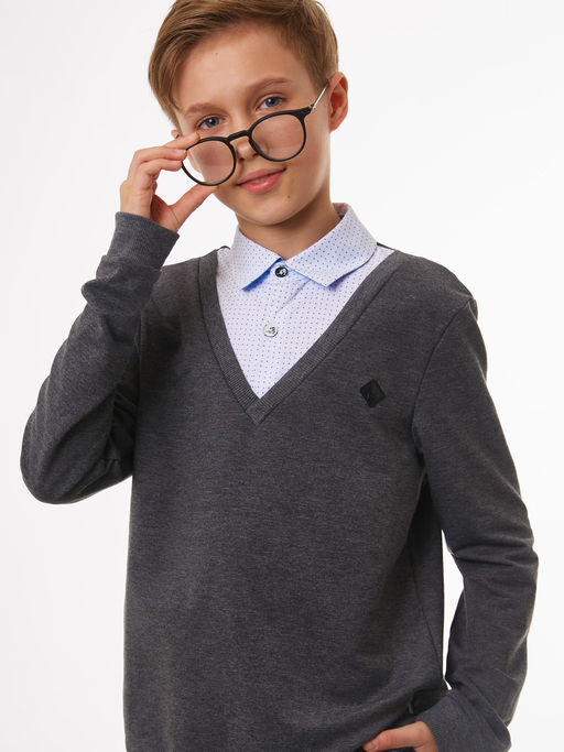 Джемпер-обманка для мальчика из трикотажного полотна и текстиля, прямого силуэта, с длинными втачными рукавами на манжете, с поясом . Горловина V-образная с отложным воротником на стойке из текстиля. Состав:92% хлопок, 8% лайкра