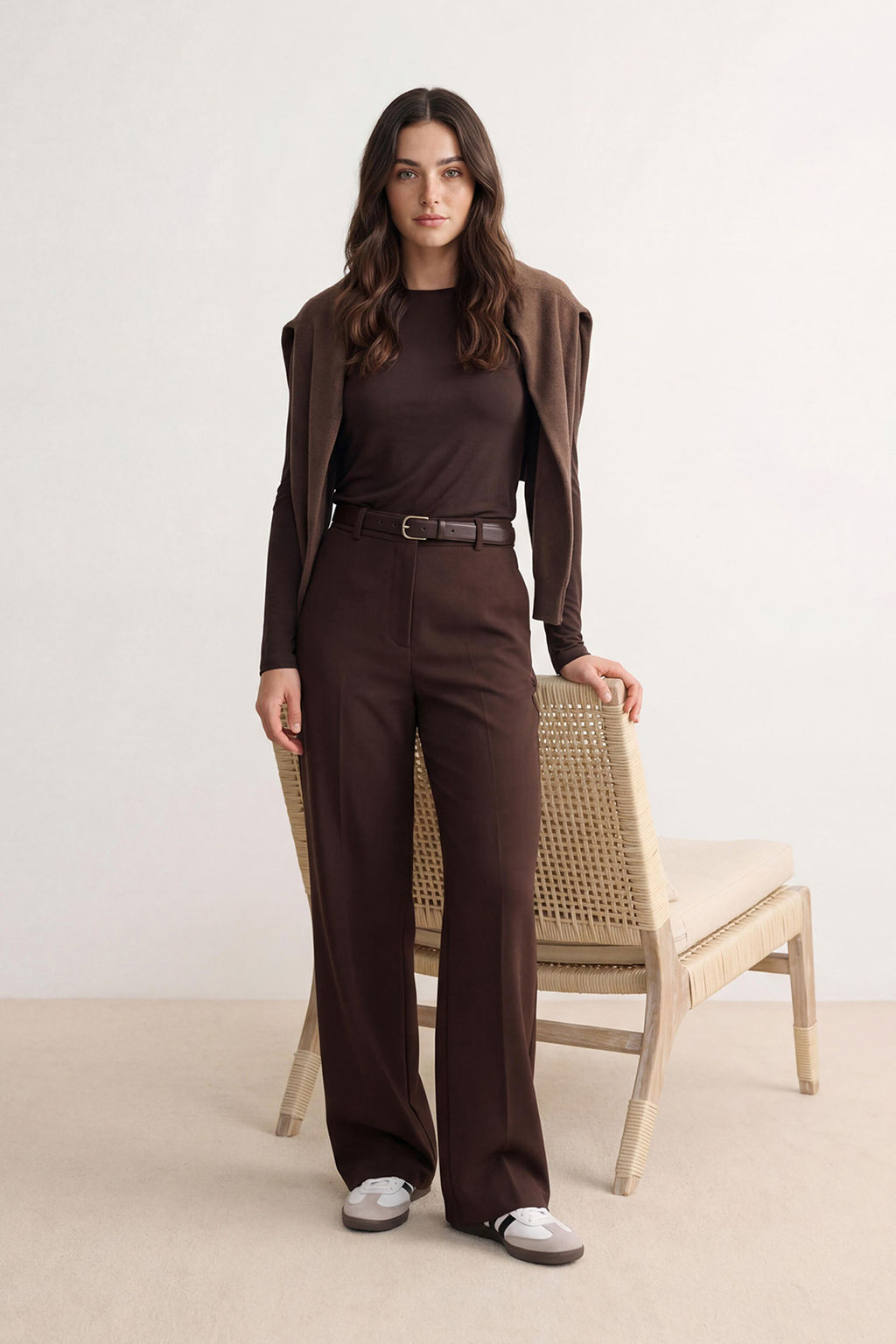 Koyu Kahverengi Genis Paca Wide Leg Bootcut Dokuma Kumas Pantolon TWOAW21PL0332