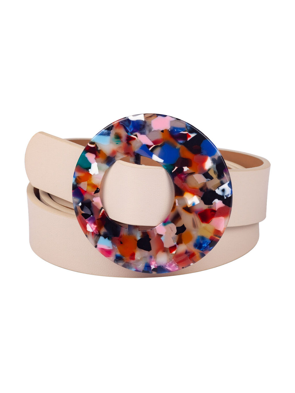 Стильный аксессуар бежевого цвета из эко кожи с ассиметричной разноцветной пряжкой. Цвета застежки станут отличным стилистическим решением при выборе цветовой палитры, чтобы сделать образ законченным и гармоничным. Щелевая пряжка позволяет легко отрегулировать размер под любую фигуру.