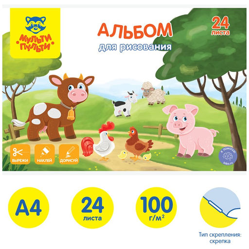 Цена за 2 шт. Альбом для рисования Мульти-Пульти 24л. на скрепке "Вырежи, наклей, дорисуй. Ферма" (А24В_44366) обложка картон