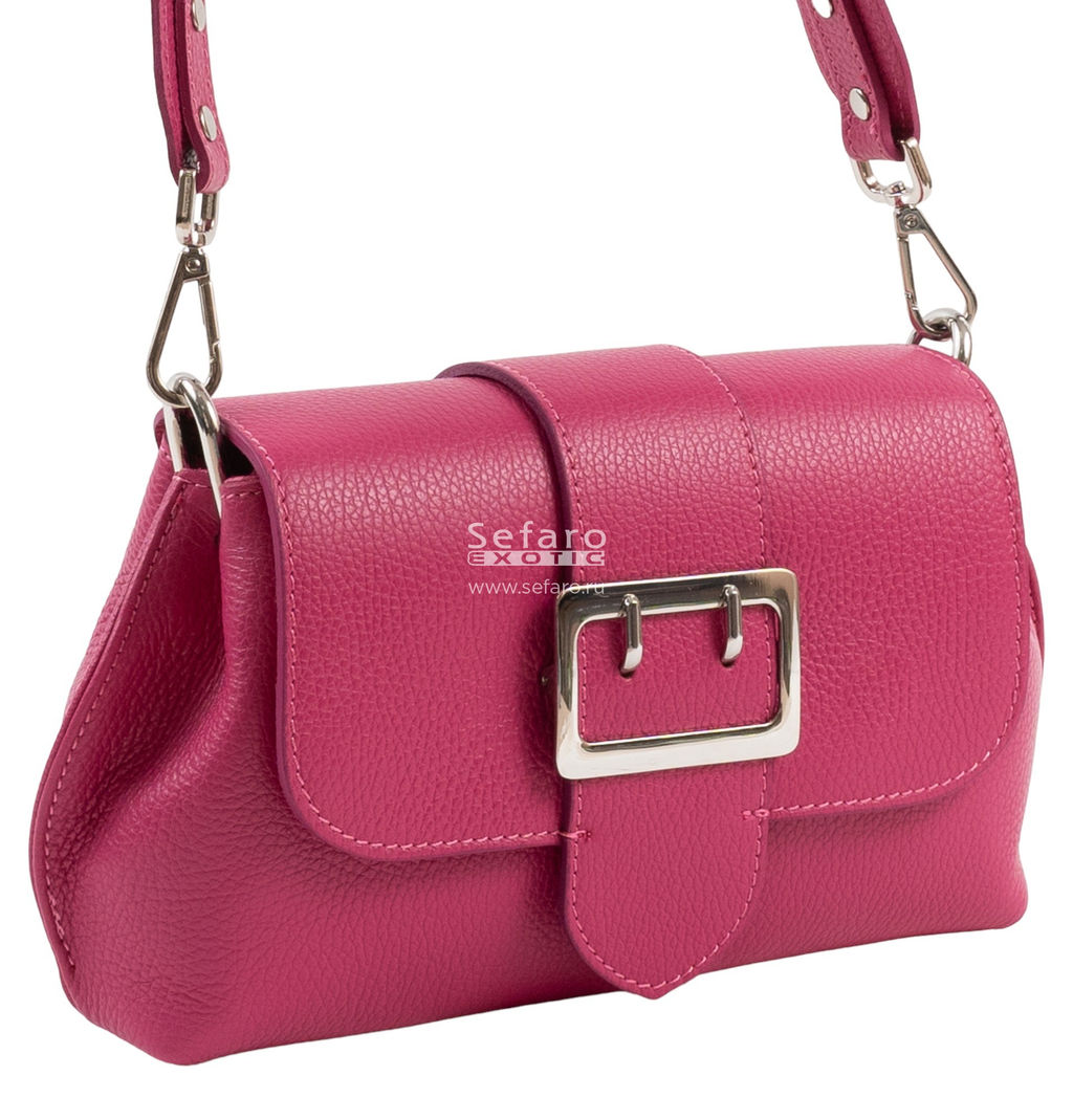Страна: Италия Акции: Товары со скидкой Производитель: Pelletteria Luisa, Italy Размер: маленькая Стиль ношения: на ремешке через плечо Форма: мягкая Выделка кожи: зернистая износостойкая Цвет кожи: Розовый Оттенок: яркая фуксия Палитра цветов: TB-105696 Dollaro Размеры: длина: 26 см \tвысота: 14 см \tширина: 6 см \t Описание: \t Стильная эффектная женская сумка кросс-боди из натуральной кожи, производство Италия. Коллекция Весна-Лето 2023, Sefaro. Сумочка выполнена из мягкой телячьей кожи зернистой износостойкой выделки - прочной и надежной. Элегантная пряжка на лицевой части придает модели шарма и очарования. Небольшая, но вместит все необходимое, подойдет для использования в качестве клатча, сочетается с вещами в стиле Casual, будет органично смотреться в классическом, винтажном, праздничном, вечернем либо повседневном образах. Закрывается внахлест на магнитный клапан, внутри: 2 отделения, разделенных карманом-перегородкой на молнии. Снаружи имеется 1 карман на молнии. Внутренняя отделка - качественная, водоотталкивающая, приятная на ощупь и долговечная в использовании, ткань. В комплекте идет плечевой кожаный ремень, который регулируется по длине. Сумку удобно носить в руках, как клатч, на плече либо через плечо практично и комфортно!