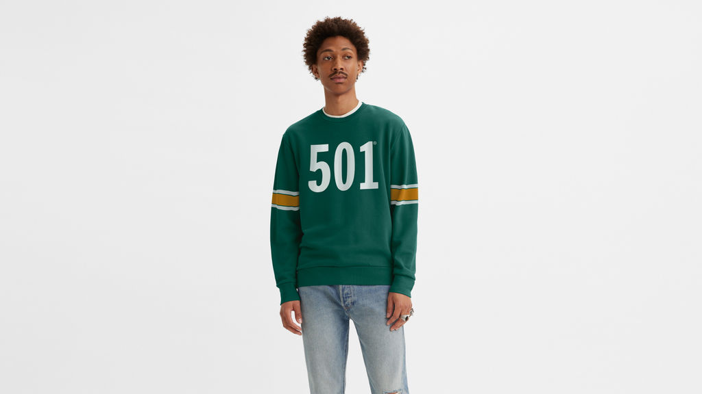 Свитшот Levis с круглым вырезом отличается свободным кроей и логотипом Levis 501 на груди. Классический крой. Изготовлен из уютной махровой ткани.