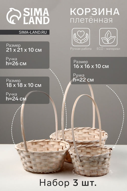 Набор круглых корзин из бамбука — это лаконичное решение для организации пространства. Сочетание натурального материала и светлого оттенка создаёт в интерьере атмосферу естественного тепла и порядка.Три корзины в комплекте: можно сортировать вещи по категориям или расставить в разных комнатах. Набор помогает выстроить единую систему хранения с гармоничным внешним видом.Плетение из бамбуковых полос: материал образует жёсткую конструкцию с ровной текстурой. Бамбук сохраняет стабильность формы при повседневном использовании.Бежевый оттенок: светлый нейтральный цвет сочетается с деревянной мебелью и натуральными тканями. Корзины легко вписываются в эко-стиль, скандинавский или минимализм.Круглая форма: корзины удобно размещать на полках, тумбах или комодах. Компактный профиль подходит для хранения в ограниченном пространстве.Применение в домашнем обиходе: набор используют для систематизации фруктов, косметики, пряжи или мелких вещей. Бамбуковые корзины служат практичным решением на кухне, в ванной или гардеробной. Комплект из трёх плетёных корзин — это сочетание природной эстетики и функциональности в поддержании домашнего порядка. Набор: Да. Форма: Овальная. Форма: Круглая. Длина, см: 16. Длина, см: 18. Длина, см: 21. Ширина, см: 16. Ширина, см: 18. Ширина, см: 21. В наборе, шт.: 3. Крышка: Нет. Дизайн: Однотонный. Бесплатная доставка: Да. Размеры товара: 10/36/21. Примечание: Ручная работа. Рисунок и размеры могут незначительно отличаться.. Примечание: Цвет может незначительно отличаться в зависимости от партии.. Примечание: На изделии могут присутствовать подтеки краски.. Примечание: Товар изготовлен из натурального материала, могут быть не значительные потёртости.. Примечание: Изготовлено из натуральных материалов. Ручная работа, размеры могут незначительно отличаться. Поверхность может иметь шероховатость, так же может быть торчащая лоза, которая никак не сказывается на функциональном состоянии..