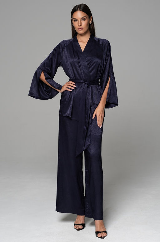 Комплект-тройка Mia-Amore состоит из топа на тонких бретелях, широких брюк и запашного жакета. Изделия комплекта выполнены из смесового шелкового жаккардового полотна. В комплекте широкий пояс. Состав:70% натуральный шелк, 25% полиэстер, 5% эластан