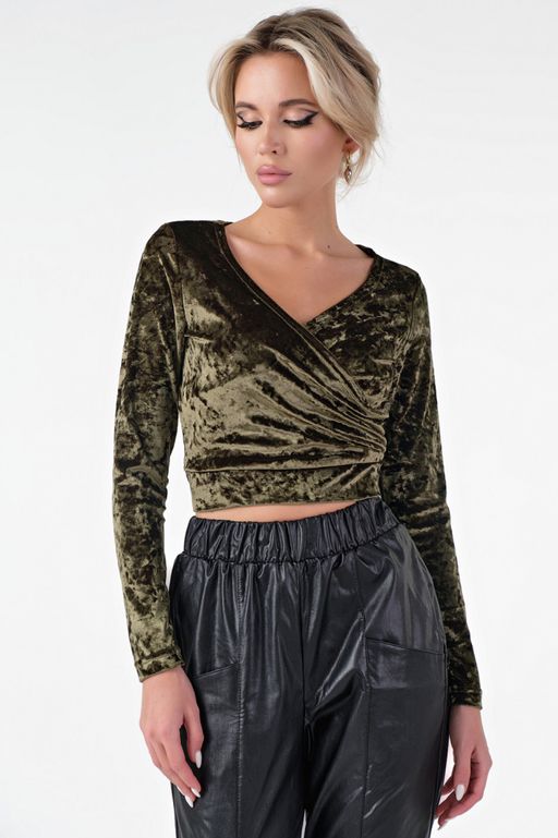 Особенности: Топ прилегающего силуэта из трикотажного бархата. Детали: запах по переду, притачной пояс по низу топа, длинный втачной рукав. Без застежки.