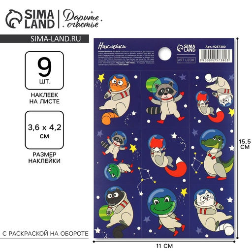 Цена за 10 шт. Наклейки детские «Космические животные», раскраска на обороте, 11×15.5 см