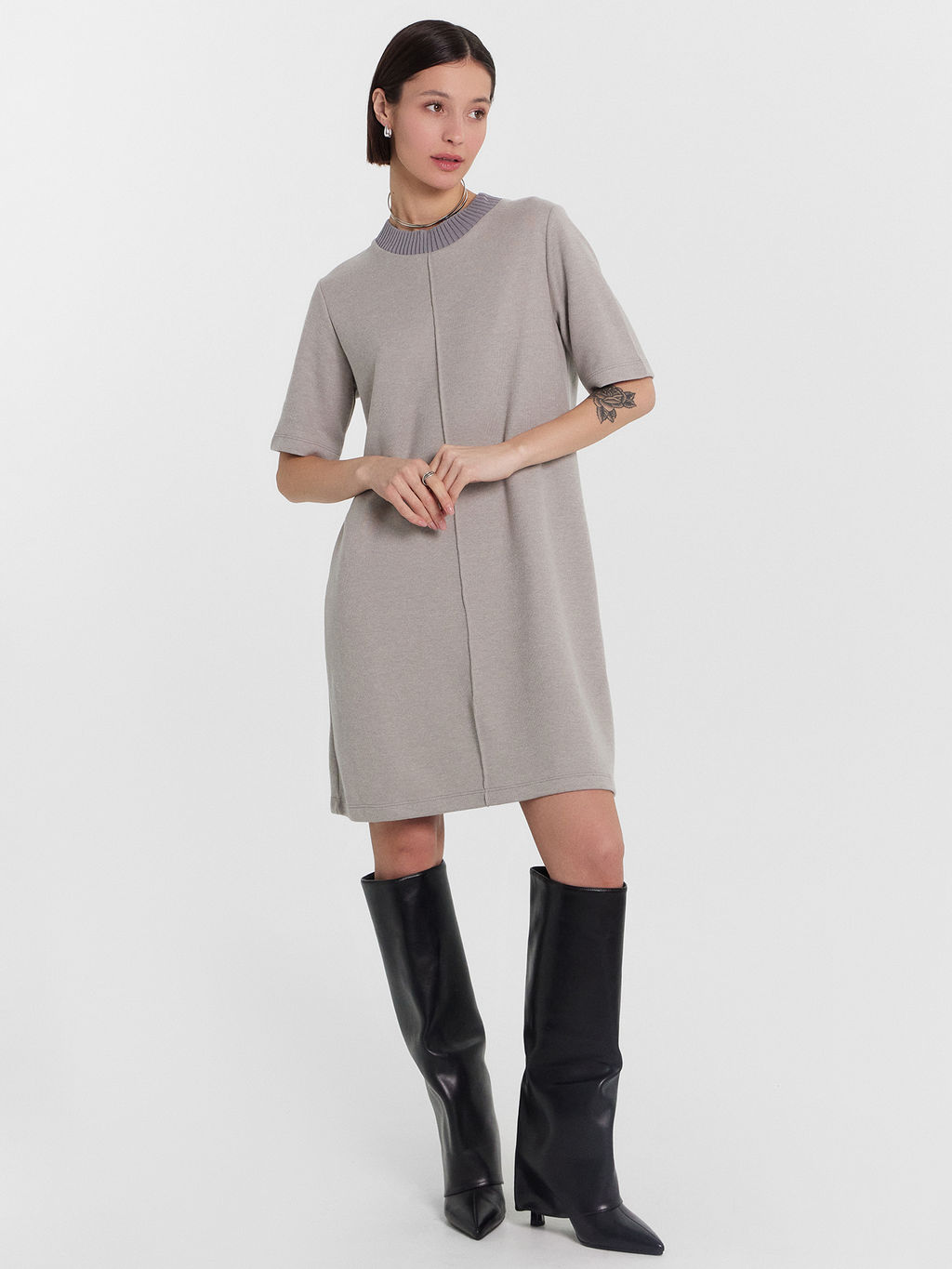 Платье А-силуэта длины мини станет прекрасным выбором для стильного и элегантного образа. Круглая горловина и короткие рукава придают ему классический вид, а передний шов добавляет уникальный акцент. Материал селаник делает это платье особенно мягким и уютным, что идеально подходит для прохладных дней. Этот универсальный и стильный элемент гардероба легко сочетается с различными аксессуарами, создавая разнообразные образы для любого случая.­