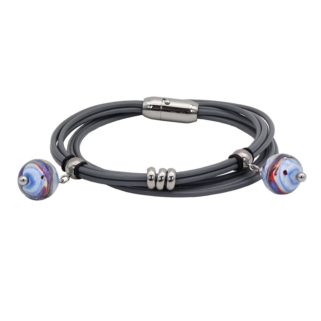 Браслет изготовлен из муранского стекла, натуральной кожи и гипоаллергенной ювелирной стали, что очень важно для людей с чувствительной кожей. Металл не темнеет и не подвергается воздействиям окружающей среды, надолго обеспечивая красивый внешний вид изделия. Крепкий магнитный замок надежно фиксируется на запястье. Ширина браслета - 1 см. Диаметр стеклянного шарика - 1,2 см. Вес - 13 гр.