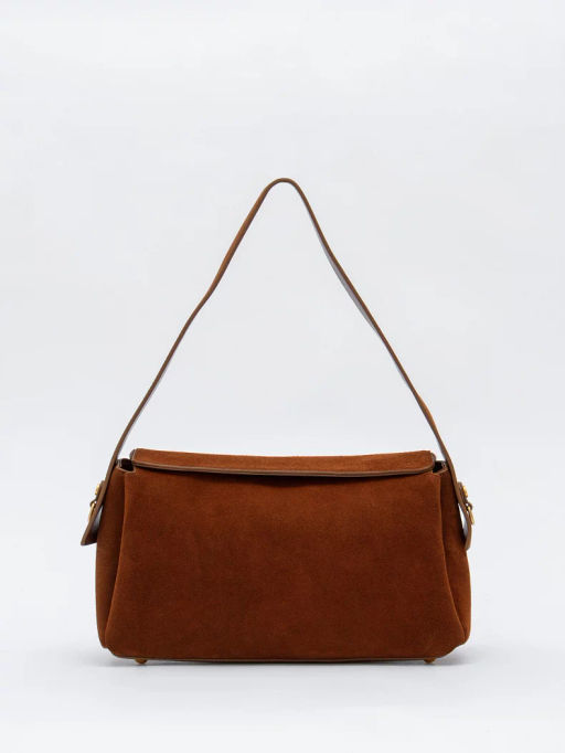 Трендовая модель, выполнена из замши. Дополнена золотистой фурнитурой. Данная модель закрывается на клапан, носится в руке за встроенную ручку или на плече. В комплекте имеется съемный ремень с регулировкой длины. Каркас полужесткий. На дне предусмотрены ножки.