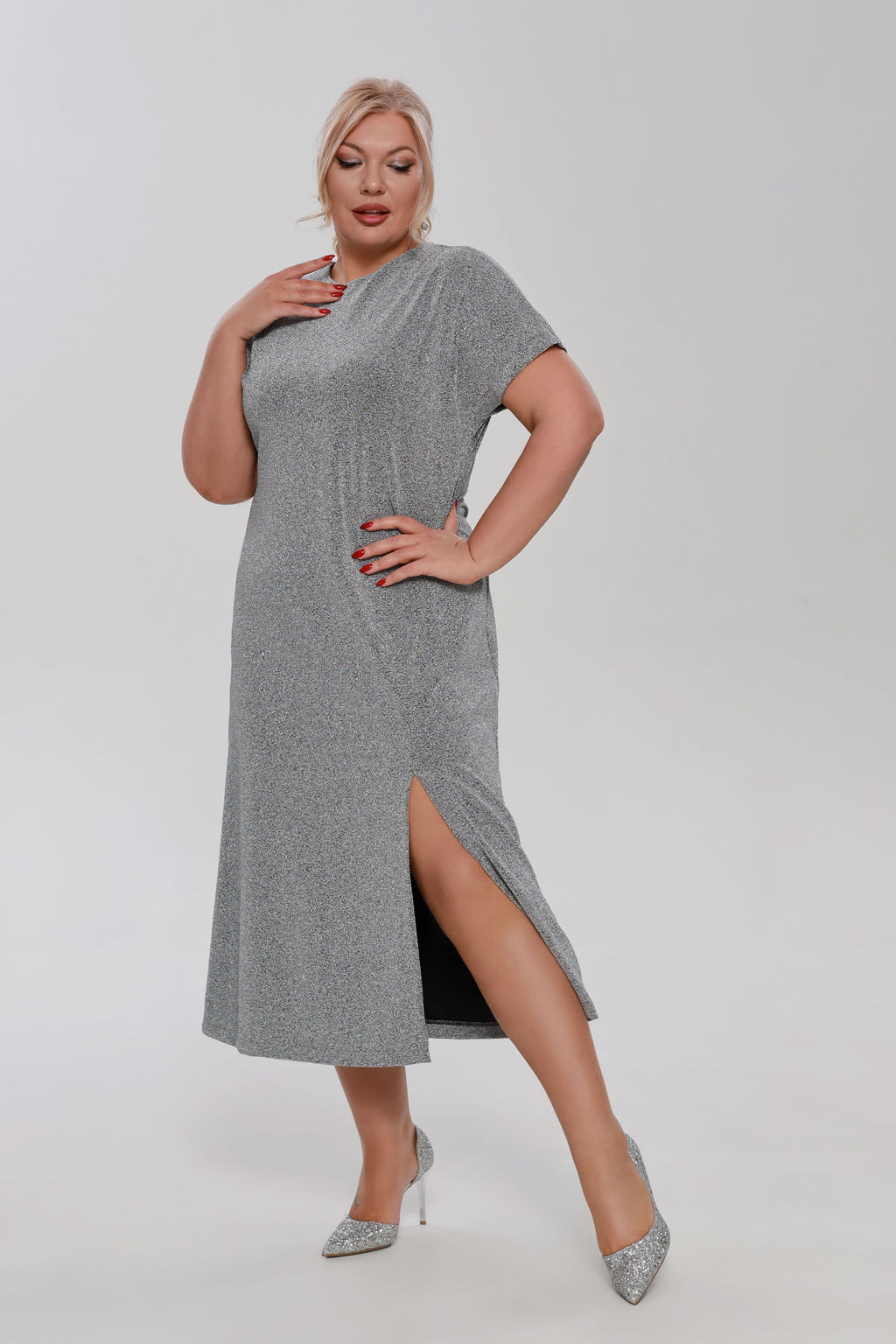 Платье представляет собой элегантный наряд, подчёркивающий женственность и утончённость образа. Его лаконичный дизайн создает уникальный баланс между простотой и роскошью. Материал платья украшен переливающимися нитями люрекса, придающими мерцающий эффект и привлекающими внимание своим блеском. Люрекс добавляет элемент роскоши и гламура, делая образ праздничным и запоминающимся. Разрез сбоку создаёт дополнительный акцент, открывая стройные ноги и создавая лёгкую игру теней и света. Такой дизайн позволяет визуально удлинять силуэт, делая фигуру зрительно стройнее и изящнее. Платье идеально подходит для вечерних мероприятий, торжественных случаев и романтических свиданий, позволяя женщине чувствовать себя уверенно и привлекательно.­