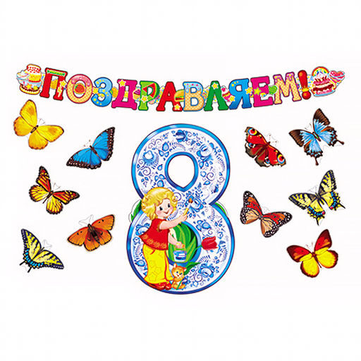 • *КБ-12689 Комплект для оформления интерьера. 8 марта (гирлянда + фигурный плакат + набор из 10-ти бабочек на скотче)