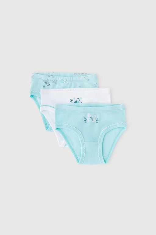 Комплект трусов для девочки. Сшиты из эластичного материала рибана пенье. В упаковке 3 штуки: сахар с принтом + светлый минт с принтом + весна. Проймы обработаны бейкой.­