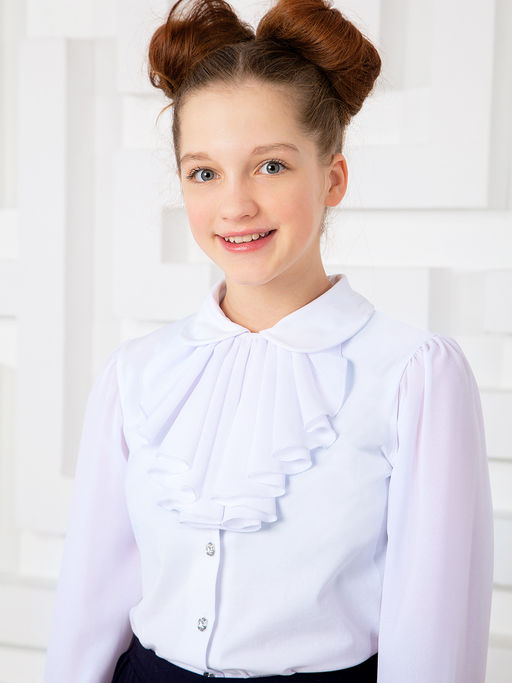 Изделие изготовлено из высококачественного трикотажного полотна,рукав длинный гипюровый.Закругленый воротничок, жабо(съмное) и рукава из шифона  делают блузку нарядной и модной.Застежка на пуговицах.Рекомендована для школы.­