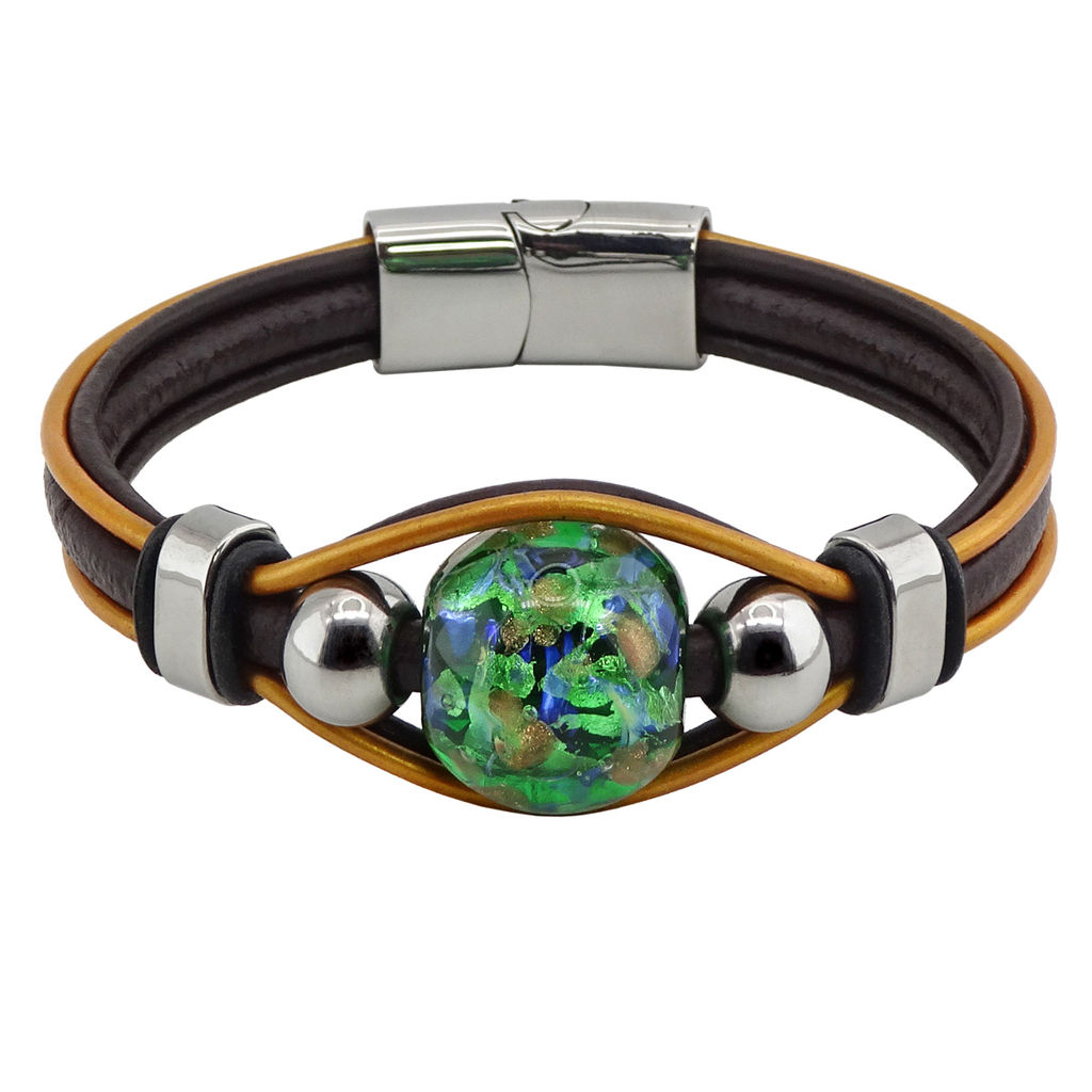 Браслет изготовлен из муранского стекла, натуральной кожи и гипоаллергенной ювелирной стали, что очень важно для людей с чувствительной кожей. Металл не темнеет и не подвергается воздействиям окружающей среды, надолго обеспечивая красивый внешний вид изделия. Крепкий магнитный замок с двойной защитой надежно фиксируется на запястье. Ширина браслета - 1,5 см. Диаметр стеклянного шара - 1,8 см. Вес - 31 гр.