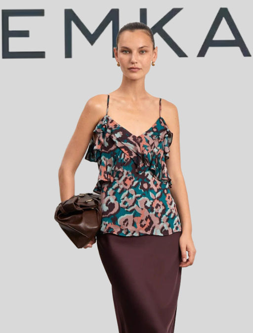 Топ с крупными абстрактными цветами сочетает в себе бирюзовый, розовый и коричневый цвета. Отделан нарядными воланами в области груди и талии. Приталенная модель на тонких бретелях отлично подойдёт для коктейльных образов и не только. Сочетается с любым базовым низом и юбкой из комплекта dora.
