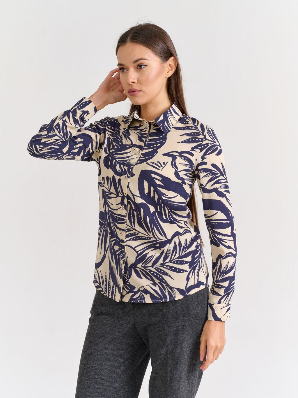Женская рубашка с длинным рукавом приталенного силуэта. Застежка расположена спереди и закрепляется на пуговицы. Рукав данной модели на манжете и закреплен также пуговицей. Элегантная рубашка, прекрасно сочетается с брюками и юбками, любого формата - от классического офисного до повседневного